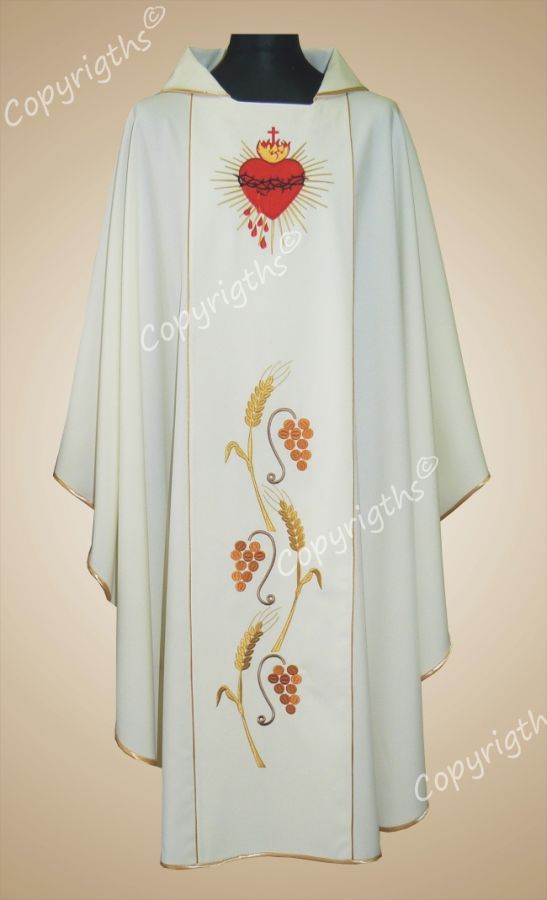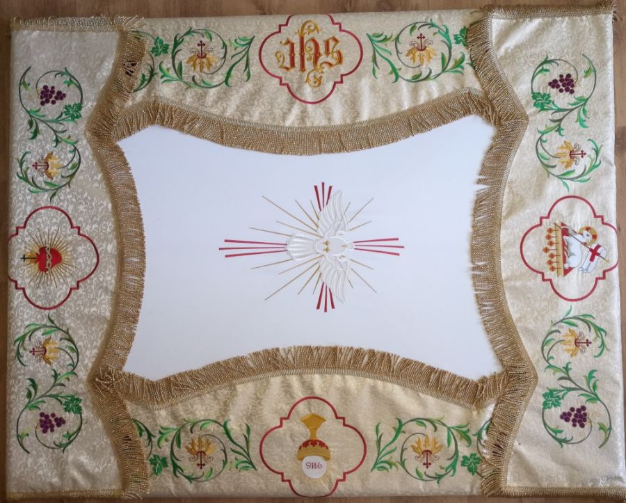 Baldachim kościelny bogato zdobiony haftem na ozdobnej tkaninie. Obszyty dookoła złotymi frędzlami. Baldachim posiada sztywny drewniany mocny stelaż, który jest obity wodoodporną tkaniną.