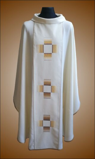 Ornat haftowany w kolorze ecru z wizerunkiem „Sercem Jezusa”, ozdobiony lamówką
