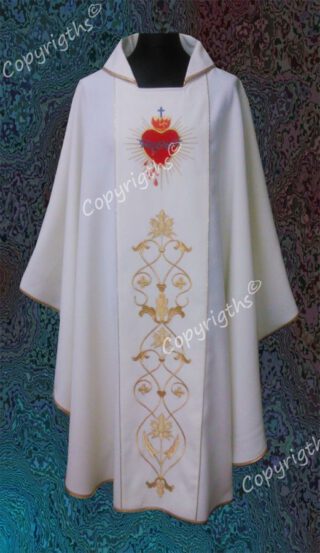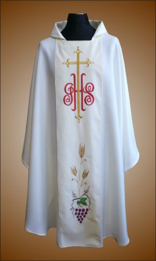 Ornat w kolorze ecru z czerwonym pasem, haftowany motyw eucharystyczny. ozdobiony lamówką.