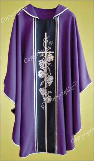 Ornat czarny z haftowanymi pasami, ozdobiony dookoła miodową lamówką, stuła w komplecie.