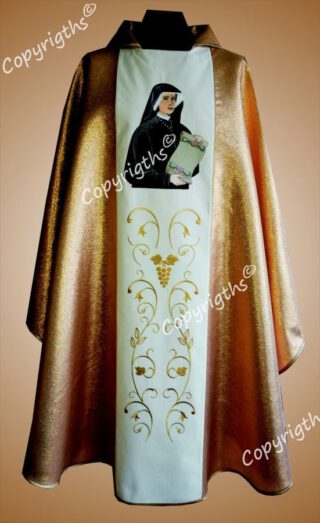 Ornat haftowany z wizerunkiem św Jana Pawła II, ozdobiony lamówką, stuła w komplecie.