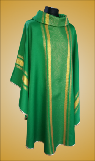 Ornat zielony z pasem tkanym, ozdobiony lamówka, stuła w komplecie.
