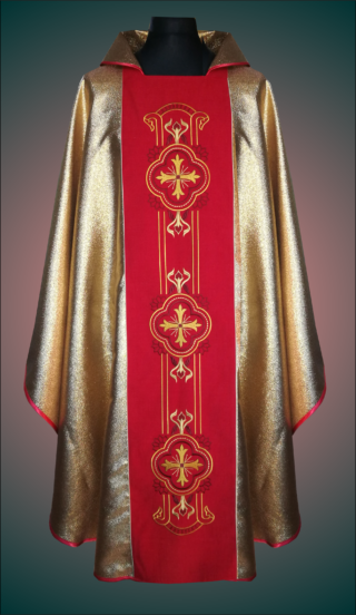 Ornat złoty z czerwonym pasem, haftowany, ozdobiony lamówką, stuła w komplecie.