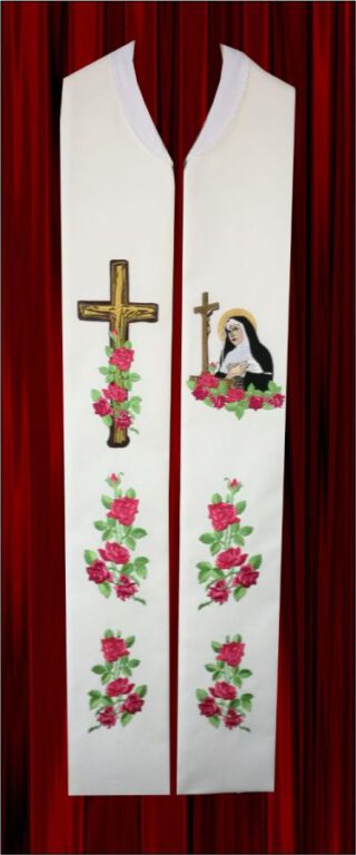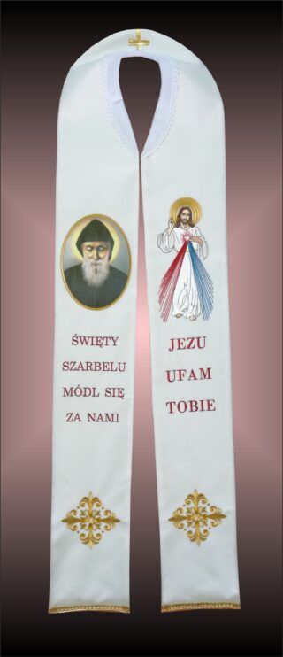 Stuła biała, haftowana z krzyżem maltańskim.